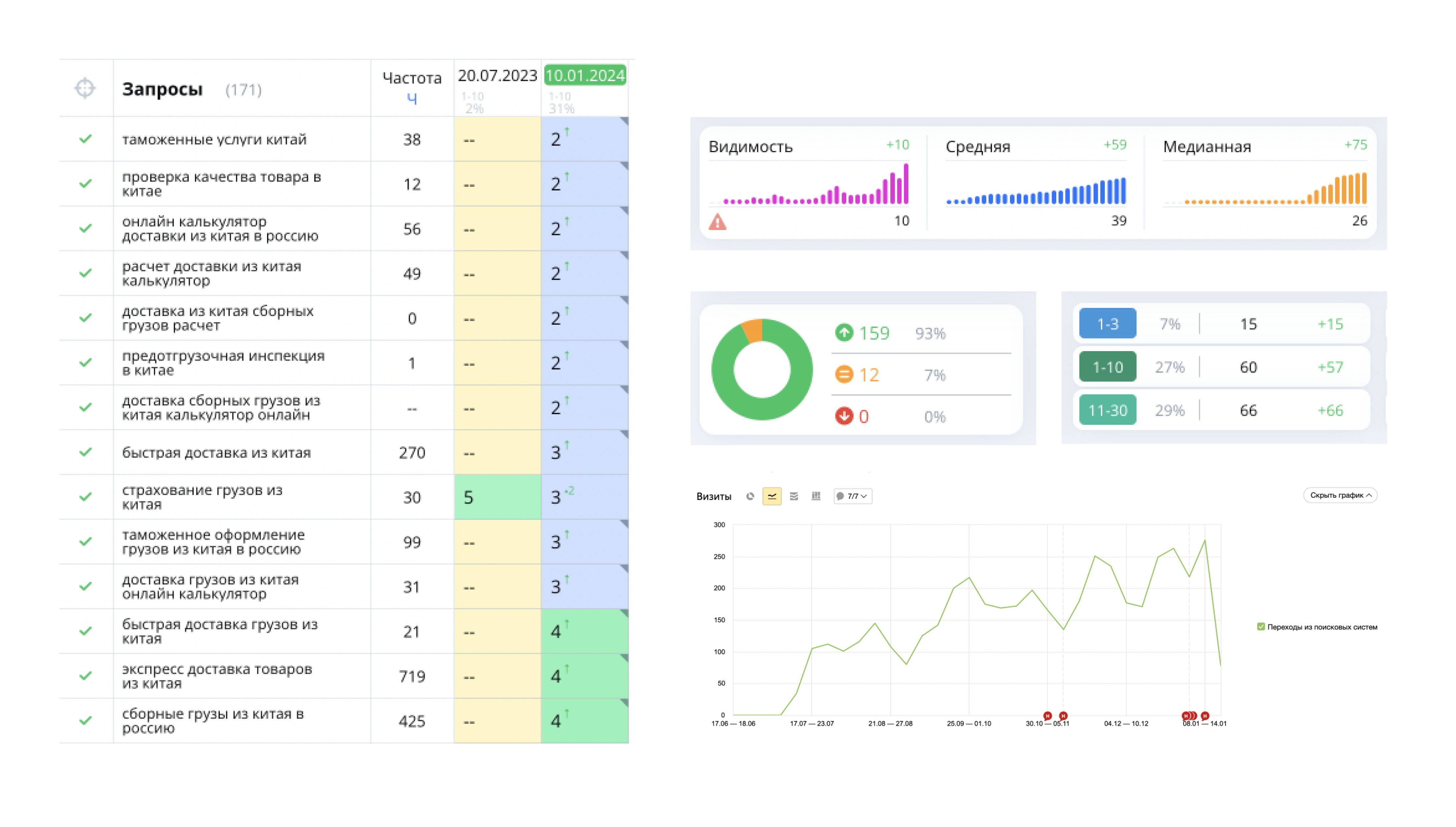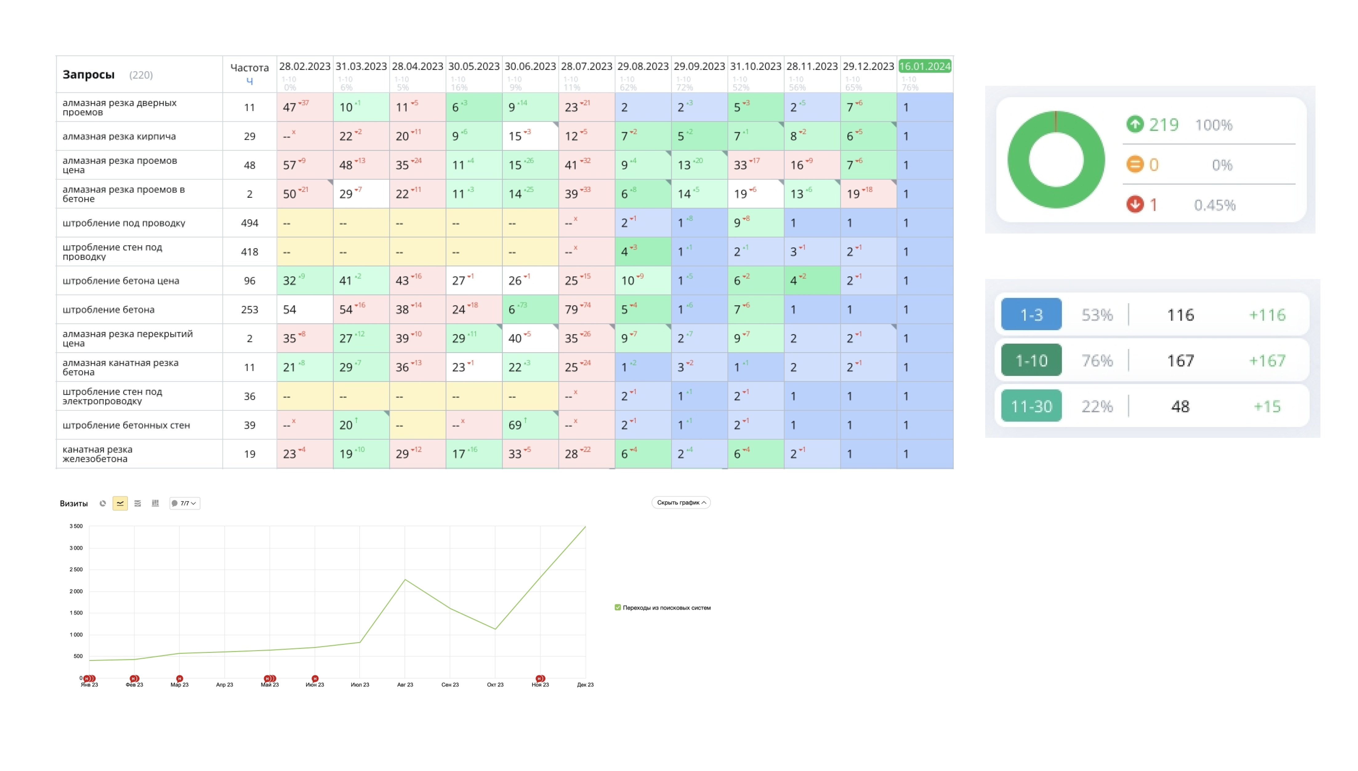 Мы не можем публиковать сайты заказчиков, но вот несколько наших результатов из разных тематик. Скриншоты из инструментов Topvisor (позиции) и Яндекс Метрика (трафик).
