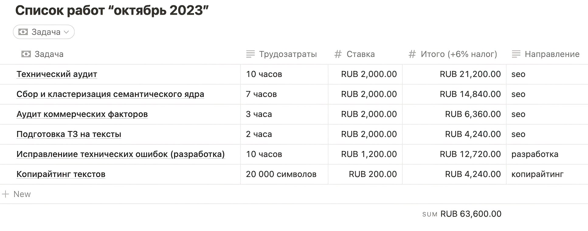 Чтобы вы могли прикинуть бюджет на месяц, вот пример расчета для среднего по размеру сайта услуг.  На проекте ранее не проводилась оптимизация. Задействованы наши разработчики и копирайтеры.